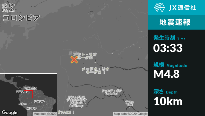 3月16日 03:33頃、コロンビアのMituから東南東157kmの地点でM4.8の地震がありました。