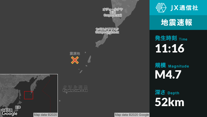 | 震源地 | ロシアのSevero-Kuril'skから南西221kmの地点 |
