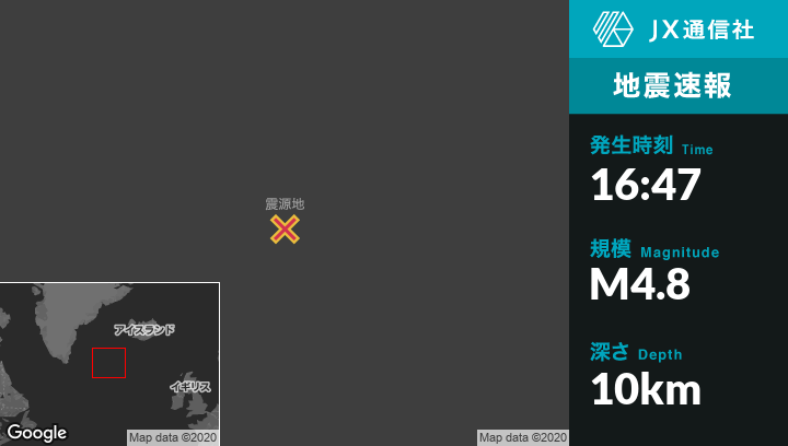 3月16日 16:47頃、アイスランドのGrindavikから南西582kmの地点でM4.8の地震がありました。