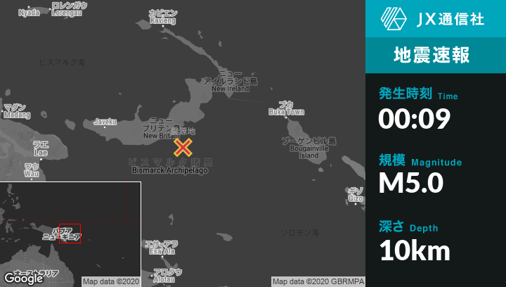 | 震源地 | パプアニューギニアのKimbeから東南東161kmの地点 |