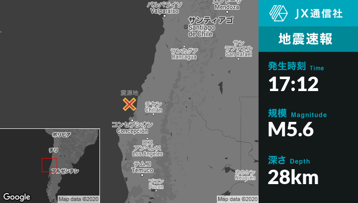 3月17日 17:12頃、チリのTomeから北北西53kmの地点でM5.6の地震がありました。
