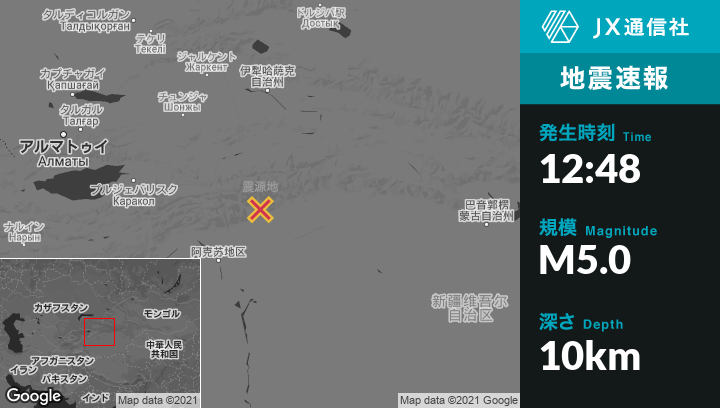 1月08日 12:48頃、中国のAksuから北東125kmの地点でM5.0の地震がありました。