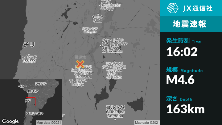 4月23日 16:02頃、アルゼンチンのLondresから東南東48kmの地点でM4.6の地震がありました。