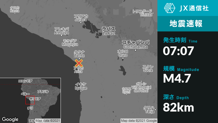 8月22日 07:07頃、ペルーのTacnaから南20kmの地点でM4.7の地震がありました。