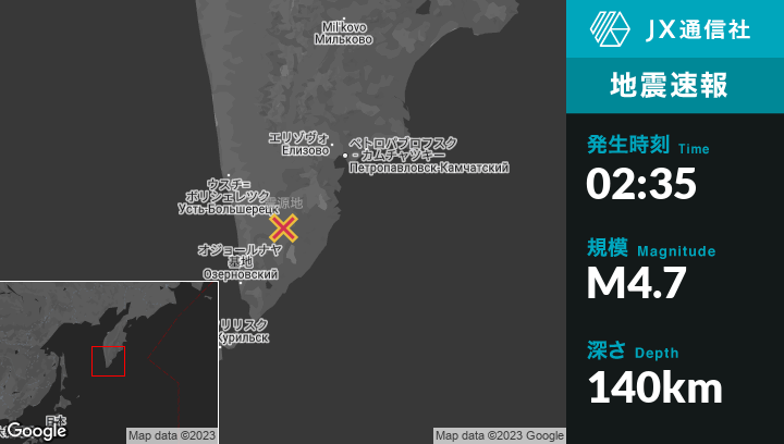 1月29日 02:35頃、ロシアのParatunkaから南西100kmの地点でM4.7の地震がありました。