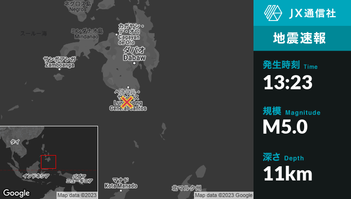 1月29日 13:23頃、フィリピンのBuriasから南西24kmの地点でM5.0の地震がありました。