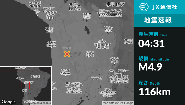 4月29日 04:31頃、チリのOllagüeから北西89kmの地点でM4.9の地震がありました。