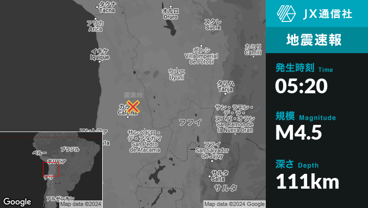 4月29日 05:20頃、チリのCalamaから北北東62kmの地点でM4.5の地震がありました。