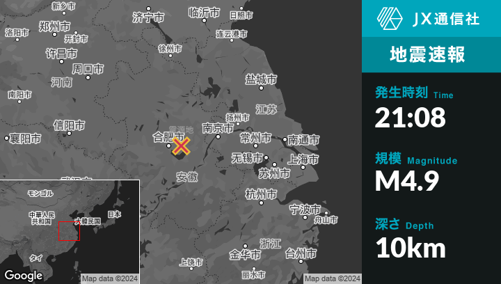 9月18日 21:08頃、中国のHefeiから東33kmの地点でM4.9の地震がありました。