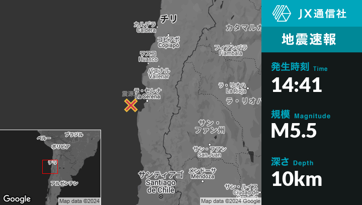 12月30日 14:41頃、チリのCoquimboから西61kmの地点でM5.5の地震がありました。