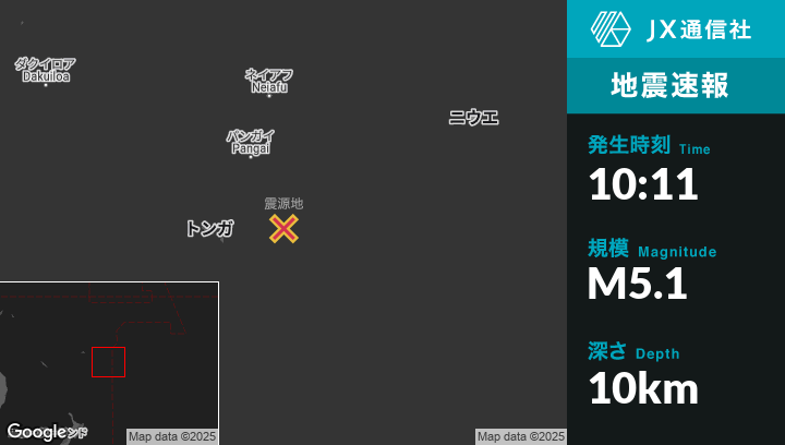 | 震源地 | トンガの‘Ohonuaから東北東134kmの地点 |