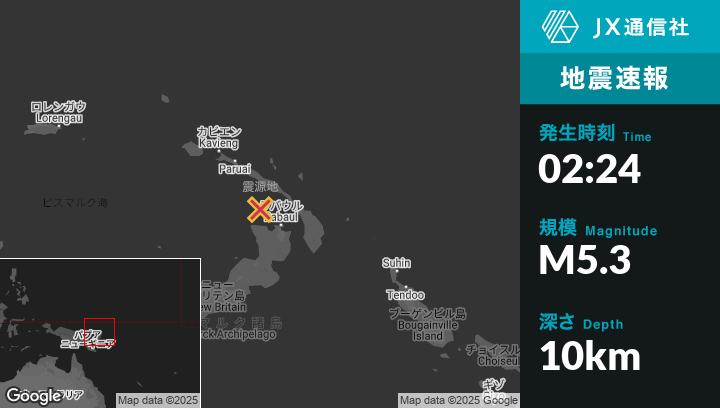 1月06日 02:24頃、パプアニューギニアのRabaulから北西72kmの地点でM5.3の地震がありました。