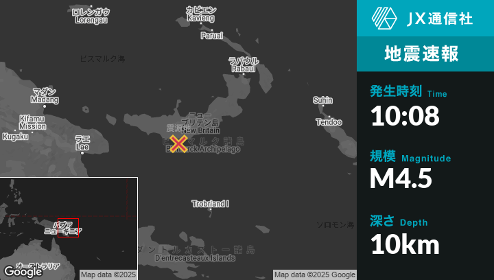 1月08日 10:08頃、パプアニューギニアのKandrianから東59kmの地点でM4.5の地震がありました。
