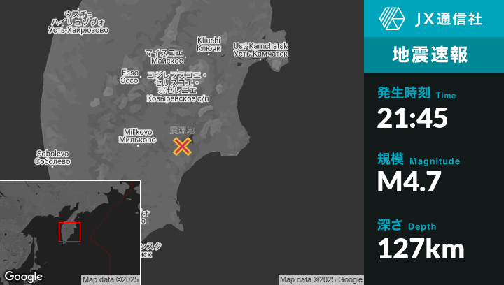 1月08日 21:45頃、ロシアのMil’kovoから東89kmの地点でM4.7の地震がありました。