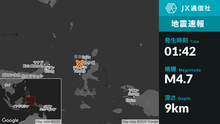 | 震源地 | インドネシアのTobeloから西73kmの地点 |