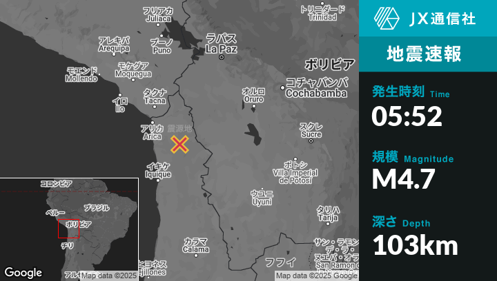 1月10日 05:52頃、チリのCamiñaから北32kmの地点でM4.7の地震がありました。