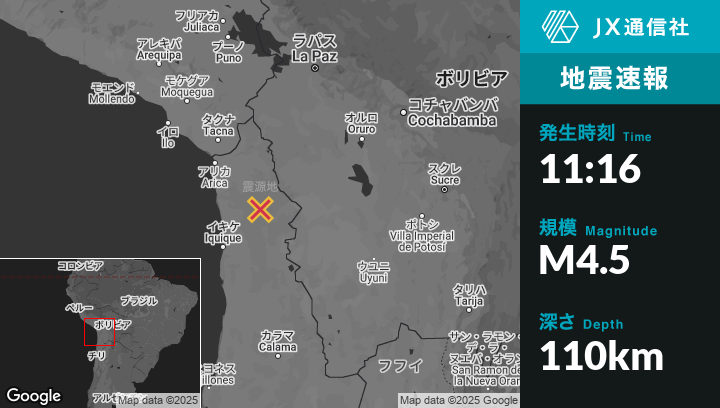 1月10日 11:16頃、チリのCamiñaから東南東11kmの地点でM4.5の地震がありました。