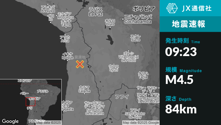 1月14日 09:23頃、チリのLa Tiranaから東42kmの地点でM4.5の地震がありました。
