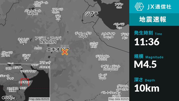 | 震源地 | エチオピアのGelemsoから南西45kmの地点 |