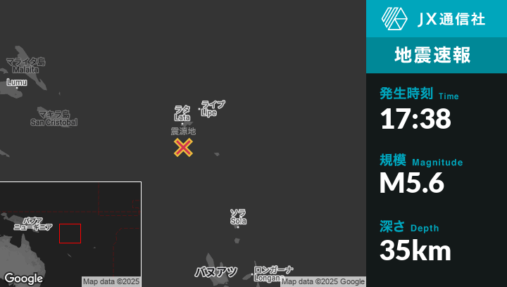 1月20日 17:38頃、ソロモン諸島のLataから南67kmの地点でM5.6の地震がありました。
