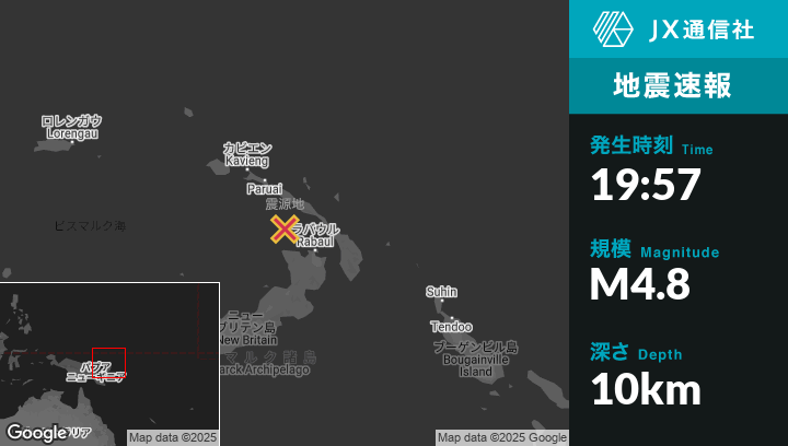 1月21日 19:57頃、パプアニューギニアのRabaulから北西91kmの地点でM4.8の地震がありました。