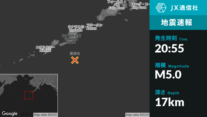 | 震源地 | アラスカのUnalaskaから南133kmの地点 |