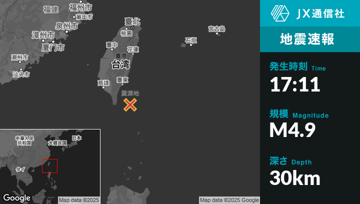 1月22日 17:11頃、台湾のHengchunから東75kmの地点でM4.9の地震がありました。