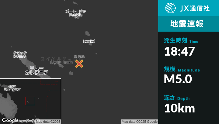 | 震源地 | ニューカレドニアのTadineから北東112kmの地点 |