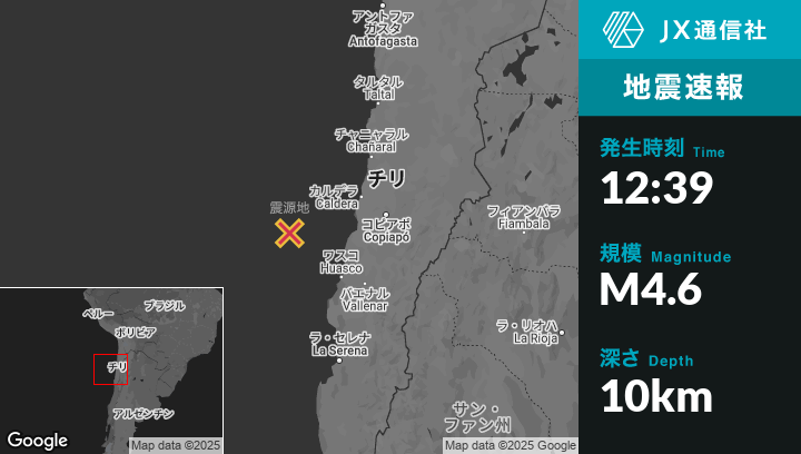 1月25日 12:39頃、チリのVallenarから北西183kmの地点でM4.6の地震がありました。