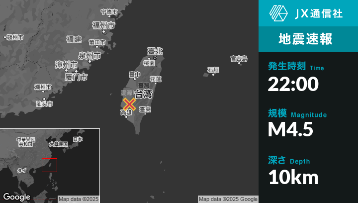 1月25日 22:00頃、台湾のYujingから北15kmの地点でM4.5の地震がありました。