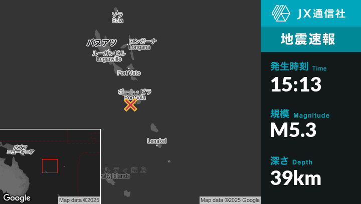 | 震源地 | バヌアツのPort-Vilaから西21kmの地点 |