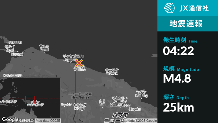 1月27日 04:22頃、パプアニューギニアのVanimoから北北西18kmの地点でM4.8の地震がありました。