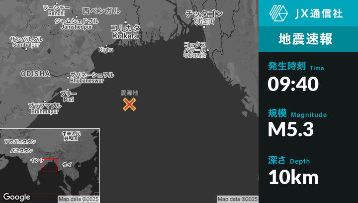 2月25日 09:40頃、インドのParādīp Garhから東南東229kmの地点でM5.3の地震がありました。