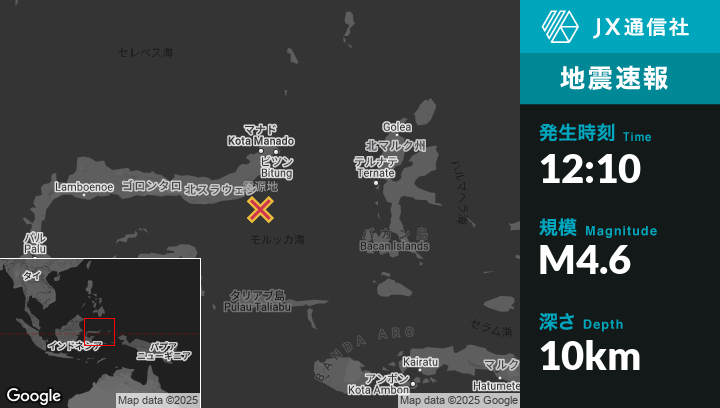 2月26日 12:10頃、インドネシアのModisiから東南東45kmの地点でM4.6の地震がありました。