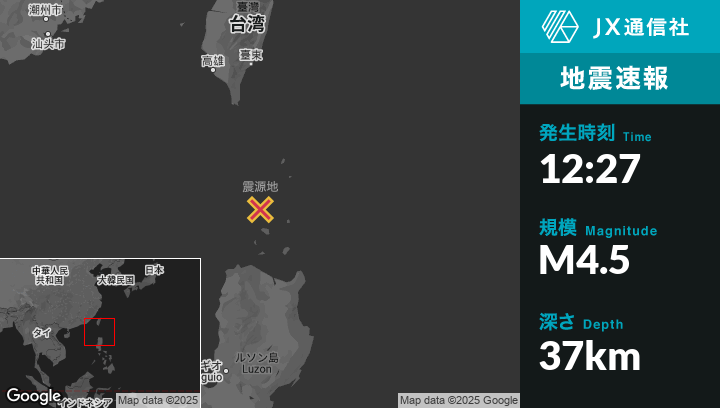 2月28日 12:27頃、フィリピンのBascoから南西89kmの地点でM4.5の地震がありました。
