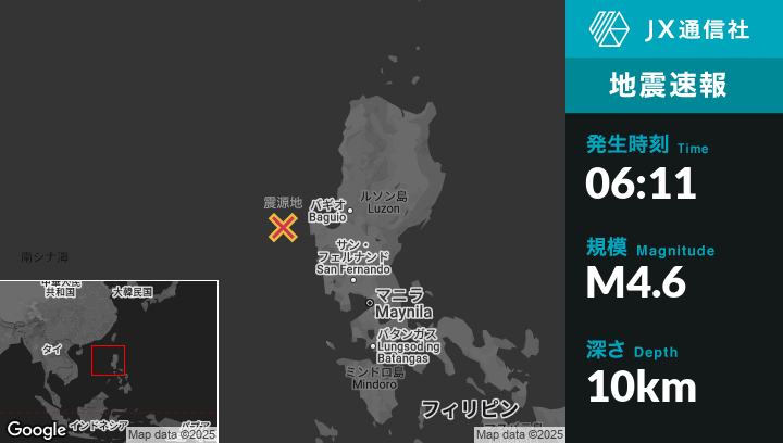 | 震源地 | フィリピンのMacabuboniから西60kmの地点 |