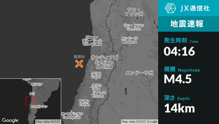3月04日 04:16頃、チリのSan Antonioから西南西89kmの地点でM4.5の地震がありました。