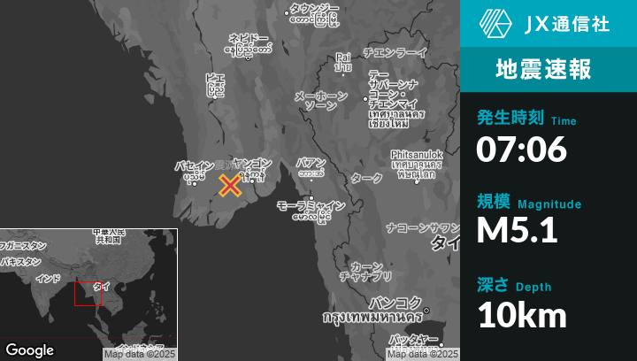 | 震源地 | ミャンマーのMaubinから北北西15kmの地点 |