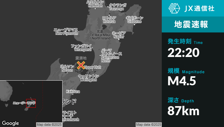 3月06日 22:20頃、ニュージーランドのWaikawaから北北東56kmの地点でM4.5の地震がありました。