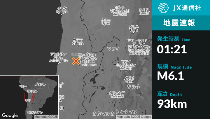 | 震源地 | チリのSan Pedro de Atacamaから西南西103kmの地点 |