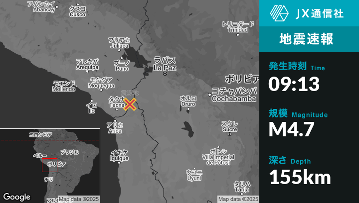 3月08日 09:13頃、ペルーのPalcaから東北東32kmの地点でM4.7の地震がありました。