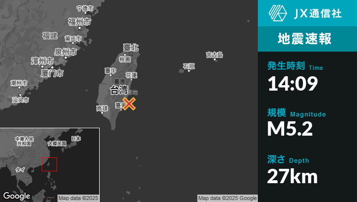 3月13日 14:09頃、台湾のHualien Cityから南96kmの地点でM5.2の地震がありました。