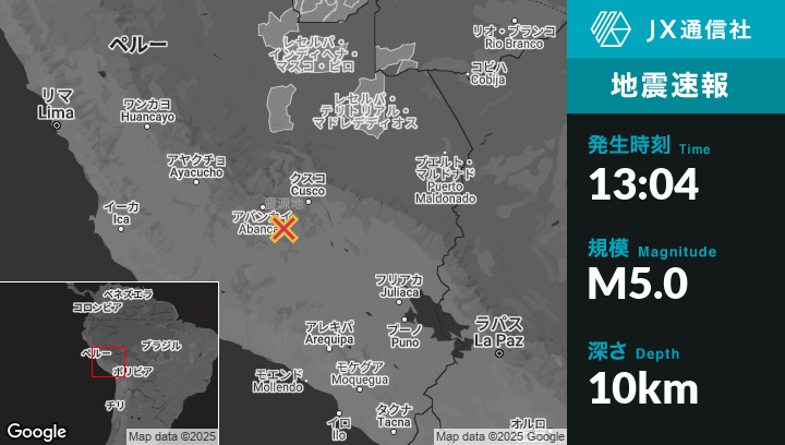 3月14日 13:04頃、ペルーのHuayllatiから東南東2kmの地点でM5.0の地震がありました。