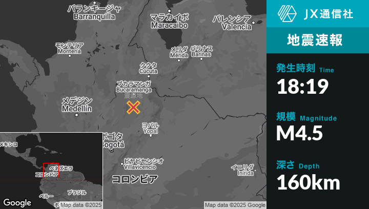 3月15日 18:19頃、コロンビアのVillanuevaから東3kmの地点でM4.5の地震がありました。