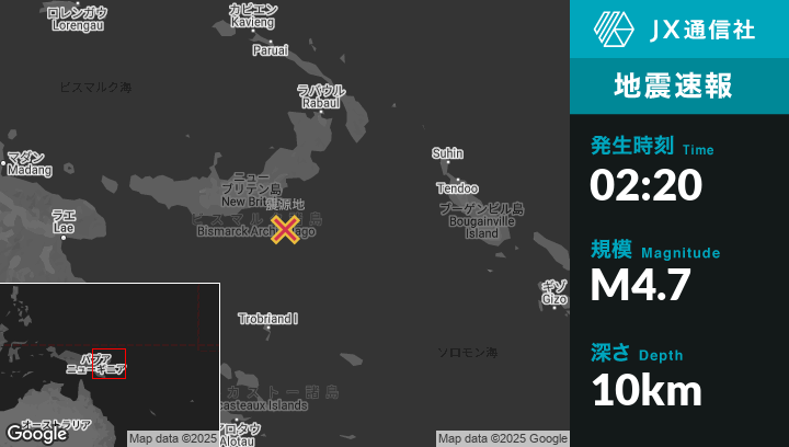 4月06日 02:20頃、パプアニューギニアのKimbeから南東172kmの地点でM4.7の地震がありました。