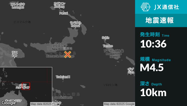 4月06日 10:36頃、パプアニューギニアのKimbeから東南東170kmの地点でM4.5の地震がありました。