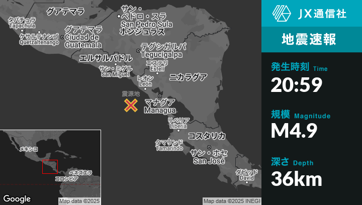 | 震源地 | ニカラグアのCorintoから南南西79kmの地点 |