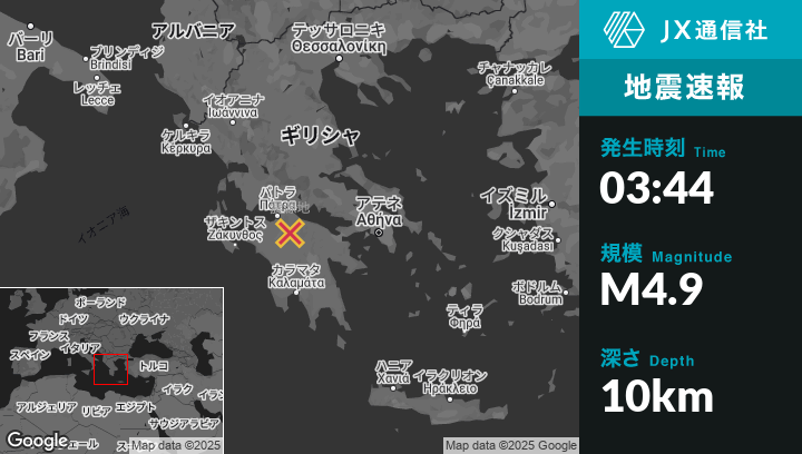 4月07日 03:44頃、ギリシャのKalávrytaから西北西12kmの地点でM4.9の地震がありました。