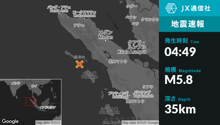 4月08日 04:49頃、インドネシアのSinabangから南東65kmの地点でM5.8の地震がありました。