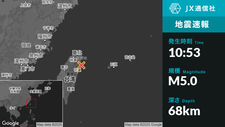 4月09日 10:53頃、台湾のYilanから南南東21kmの地点でM5.0の地震がありました。